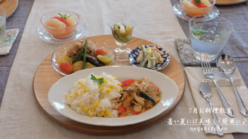 ●鶏肉とトマトのチーズとじ みんな大好き、我が家の定番レシピです。 何より簡単に仕上がるフライパンクッキング。 あっという間に作れるので、時間の無い時の食事づくりには 本当にありがたいレシピです。 牛肉でもよし。豚肉でもよし。厚切りのお肉で作ると 大変なお御馳走になります。おためしを♪ ●とうもろこしごはん シンプルが一番おいしい♪の代表メニュー。 とうもろこしの甘味とごはんの甘味と 夏には是非おすすめしたいメニューです。 女子は間違いなく好きなはず^^ ●茄子と豚しゃぶのバルサミコマリネ こちらも我が家の定番レシピです。 茄子好きにはたまらない夏のお献立。 一緒にやわらかいお肉も食べられるのて更に好き^^ たっぷり作って思う存分食べたい一品です。 ●きゅうりとカニカマのれもんマヨサラダ こんなレシピこそ、沢山知っておくと食事作りが楽になります。 使いやすい食材も、少しのひと手間でグーーーンと旨みupで 美味しくいただけます。お手軽で、作りやすく、美味しい♪ 三拍子揃った主婦にありがたいレシピです。 ●季節野菜のピクルス 市販のピクルスより絶対美味しい♪ 暑い夏にはお弁当の隙間にもいいから是非。 刻んでタルタルソースにも、茹でたじゃが芋と シンプルなサラダに。とにかくいい塩梅のピクルス。 ●グレープフルーツゼリー 簡単に作れるから嬉しいね♪ 自家製はヘルシーで、身体にもやさしくて。 いろいろなフルーツでお手軽に楽しんでください^^ 今年は台風の影響で7月16日、予定より早い終業式でした。 夏休みが早くスタートし、24日には四国も梅雨明けを 迎えました。 暑い毎日にはどしても冷たいものや、食べやすいもので パパっと食事を済ませがちですが、やはり美味しいもの、 スタミナのつくものをしっかり食べて日々を大切に過ごすことは、 楽しい夏を過ごすためのベースです。 今回のレッスンでは、作りやすくて、美味しい♪を 全力でご紹介しました。あっという間に出来るので これなら作ろう♪と思われた方も多いはずです。 暑さの厳しい今年の夏ですが、素敵な思い出を沢山作って いい夏だったな・・・と思える毎日を過ごしたいですね。 熱中症には気を付けて^^7月のお料理教室も 沢山の皆様にご参加いただき、ありがとうございました^^