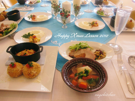 今年もいつもの食卓に 少しだけ手の込んだ美味しくて、 みんなが喜ぶメニューでプレクリスマスです。 ☆ ハーブローストポーク・バルサミコソース添え ☆ スップリー♪ ☆ 茄子のチーズ焼き ☆ いろいろ豆のマリネサラダ ☆ 蕪とソーセージのスープ ☆ パンナコッタ・マチェドニアソース ハーブ塩作りから始まったローストポークレッスン。 ハーブ塩があったら お料理の幅が広がりそう♪ ハーブ塩にハーブ酢。 今回はハーブ塩をたっぷり使って ローストポーク。 しっとり仕上がって 加えてとってもお手軽。 大人気のレシピとなりました。 とっても美味なバルサミコソースを添えて♪ スップリー♪世間では スップリ!です。ライスコロッケ。 真ん中に大きなモッツアレラチーズをたっぷり包んで。 本日はサフランライスでグレードアップ♪大人の味。 トマトソースをたっぷり敷いて・・・といきたいところですが もう一品の茄子のグラタンを合わせたら もう最高♪ この季節は生のトマトはお高いので。。。 じゃあ〜 主婦にとってもありがたい トマト缶を使って まずは 美味しい美味しいトマトソースを作りましょ♪ から始まった 茄子のチーズ焼き。 レッスン後 箱買いをしました!という報告があったほど とっても好評だったトマトソース。 茄子のグラタン 最高!とこれまた大好評のグラタン。 日本製の鉄鍋も大人気でした。 いろいろ豆のマリネサラダ。 最近はお手軽な缶詰も多く出回っていて とっても身近になったいろいろ豆。 そんな中で 一種類だけ自分で茹でて加えたら “あら!食感が違って面白い。” ワインにも合うし 身体にもいいから たーーーっぷり作って いっぱい食べちゃってください^^ 蕪の美味しさを最大限に生かしたスープ。 いやいや 野菜の美味しさを♪かな。。。 しかし蕪のポイント高し。 ざくざく切って 火にかけて・・・ 放っておいたら出来るので あまりの手軽さに ありがたや〜〜〜♪子どももいつもよりいっぱい食べました^^ と嬉しい報告も多々でした。 野菜って ほんとに甘いっ!^^ 季節の果物を取り合わせて・・・酸味と甘みも・・・ まずはイタリアンのデザートでもあるマチェドニアを作って それから生クリームを煮た パンナコッタを作って 両方を組み合わせたら パンナコッタ・マチェドニアソース。 型に入れて抜いてもよし。器に直接盛りつけてもよし。 あなたはどちら派ですか・・・? 今年も沢山の皆様にご参加いただけ 楽しいレッスンと なりました。 赤とグリーンが定番のクリスマスですが ブルーの色も新鮮で ちよっと大人の感じ。 おいしいごはんと お気に入りの器と 好きなものを並べてみて いつもとちょっと違った・・・に挑戦してみては? 本番のクリスマスがどうぞ素敵な食卓になりますよう 頑張って〜♪と心より 応援しています^^